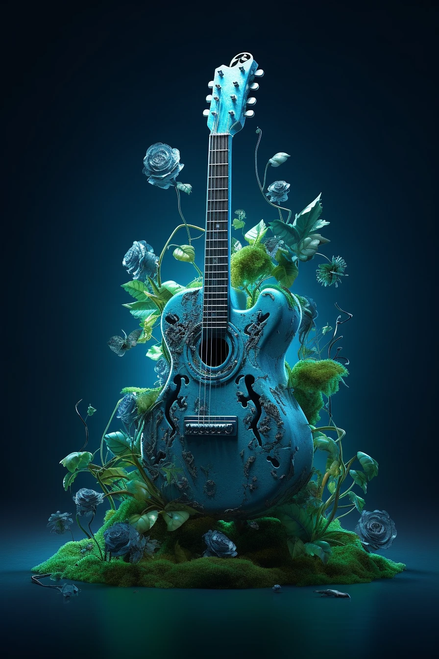 A guitar made of skulls, entwined with thorny plants adorned with small green leaves, the entire composition illuminated by a soft blue light, cinematic lighting, 3d prop art, --ar 2:3 --v 5. 1