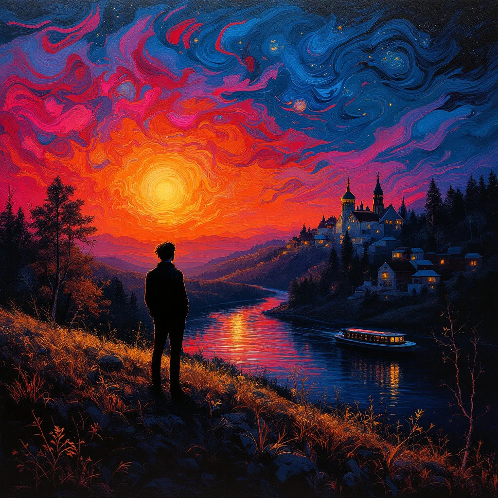 "A solitary figure on a hill, gazing at a distant village under a surreal sky where a blood-red sunset merges with dark blue twilight. The river reflects the last light like a winding serpent, and the ferry is a tiny silhouette. Swirling brushstrokes in the style of Van Gogh's 'Starry Night', but with a palette of burgundy, navy, and ochre. The painting captures the philosophical tension between earthly roots (village) and infinite longing (sunset) . Textured impasto, visible canvas grain —ar 3:4 —style raw" "subtle smile on the man's face, eyes full of quiet determination, wind blowing his hair" "wooden Orthodox church with golden dome, birch trees, lanterns flickering in the twilight". "Create a visual metaphor for 'truth and beauty' through this landscape, with subtle divine light touching the village and the river. "