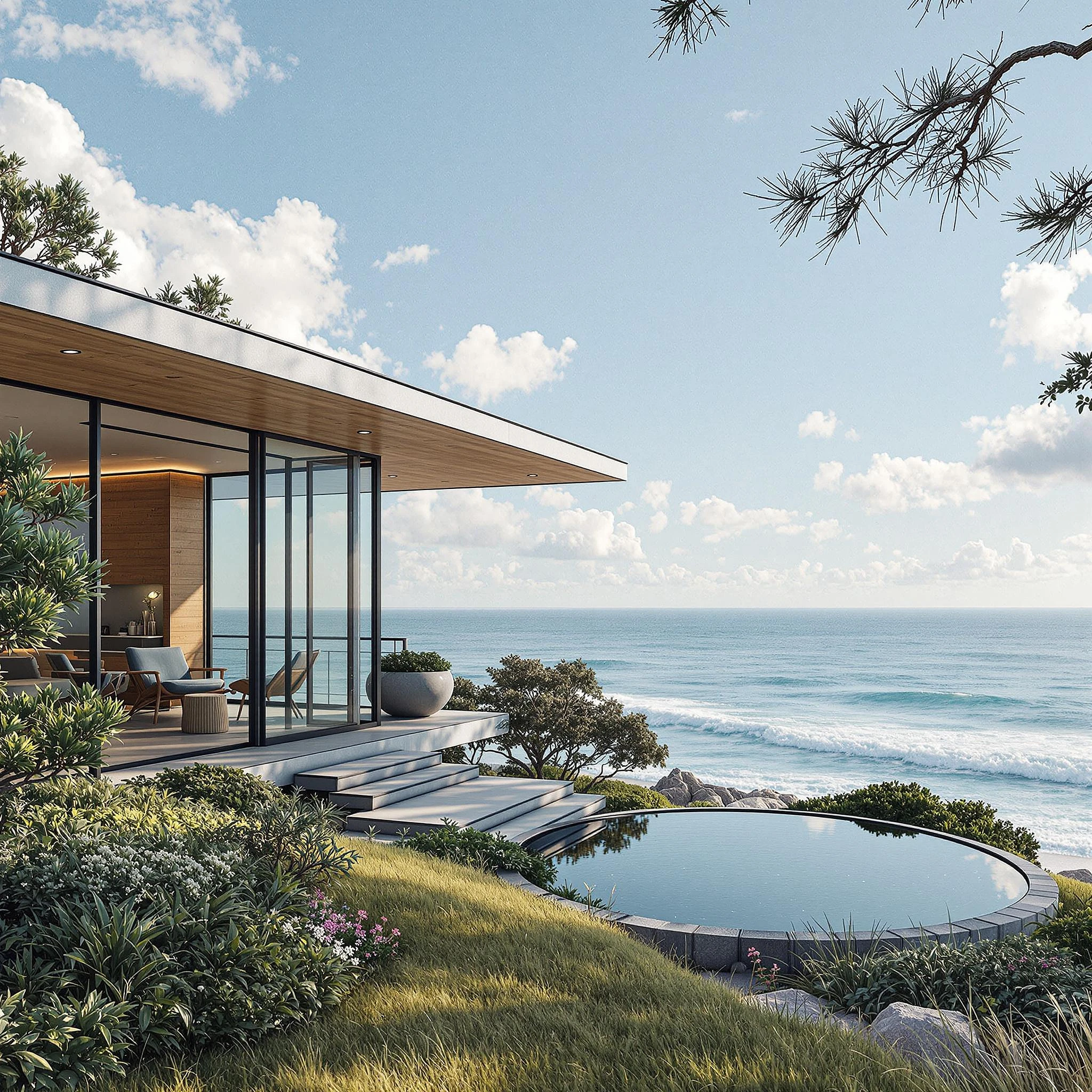 Hyper realistic eye level exterior photo of a mid century modern style house overlooking the ocean, daylight, indirect lighting, AD magazine, Frank Lloyd, Eames, Mies van der Rohe