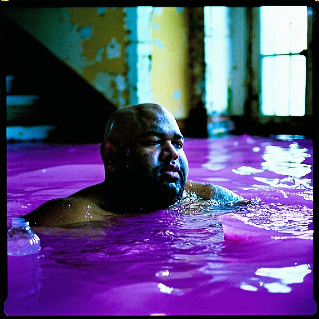 grainy 80's photograph quality polaroid of big fat bald soft round black man drowning in purple drink caught in an abandoned house, dark