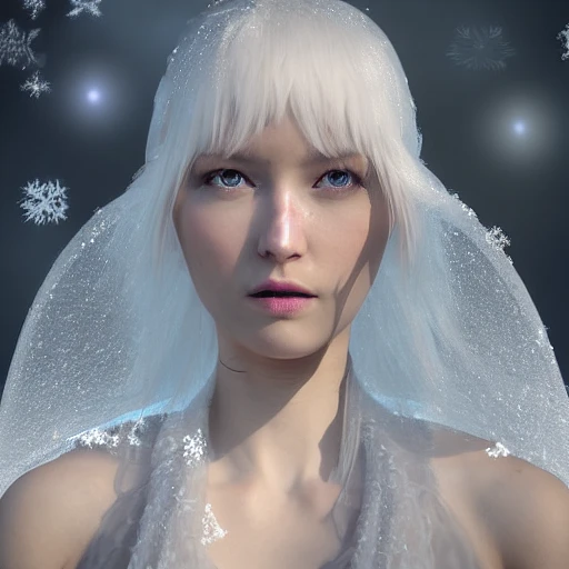 beautiful ice female, dress made from ice, snow falling and creating her hair, long neck :: photorealistic, highly detailed, true photography —beta --upbeta, --testp, symmetrical, trending on ArtStation, ultra photorealistic, long lashes,