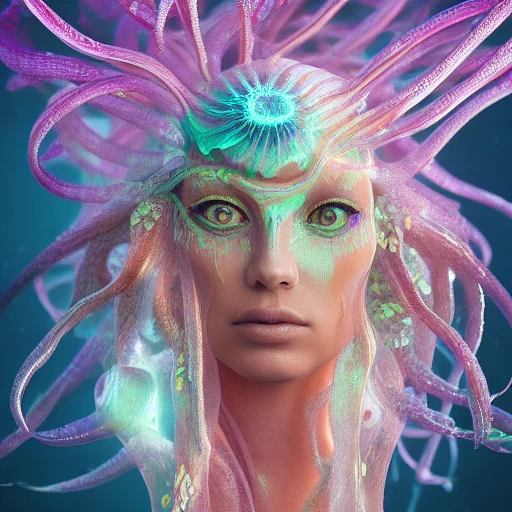 Goddess close-up portrait ribcagel. jellyfish phoenix head, nautilus, orchid, skull, betta fish, bioluminiscent creatures, intricate artwork . octane render, trending on artstation, t symmetrical artwork. cinematic, hyper realism, high detail, octane render, 8k