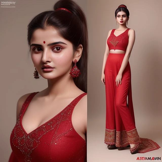 Hyper realistic potrait of a girl who looks like tara sutaria, armeena khan, pakistani beautiful model, no dark circles, wearing natural makeup, wearing a red party gown, full body potrait, no NSFW, face should be high definition without any deformity, hair tied in ponytail