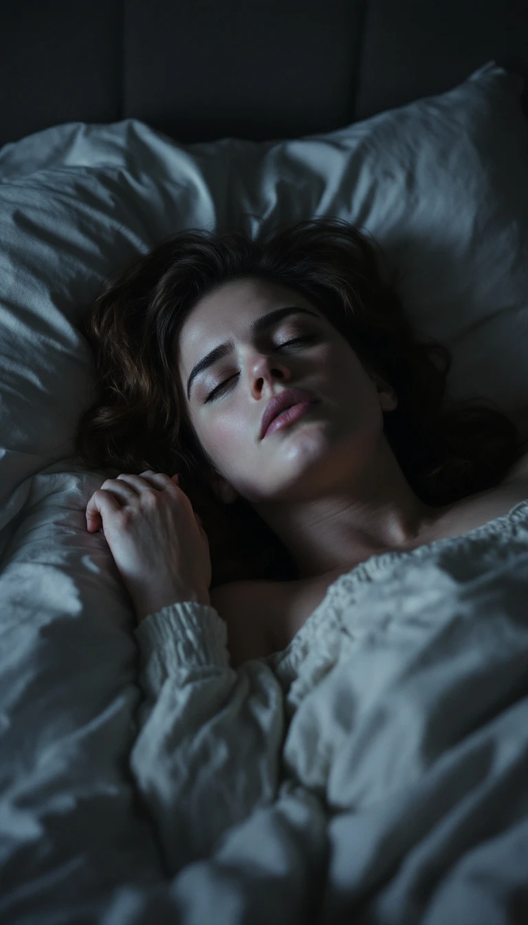Tired, Hayley Atwell , 24-30 years old, bedroom, A plus size full body, night, low light.