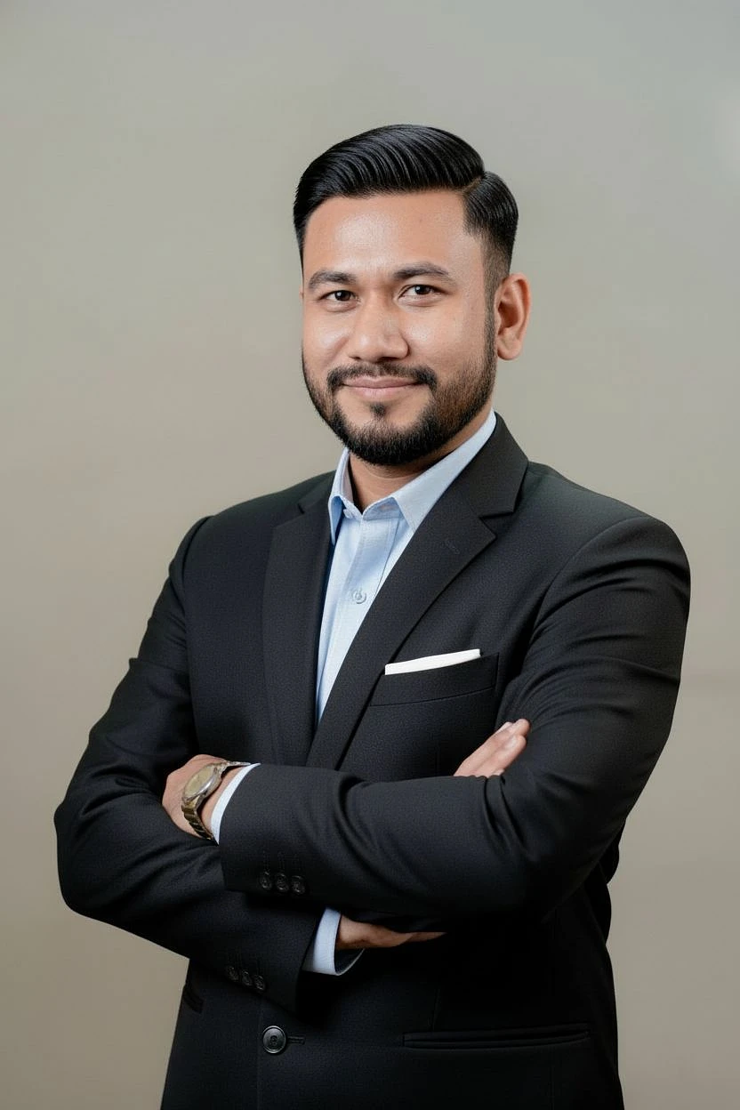 A professional studio headshot of a confident man with a neat beard and styled hair, wearing a black suit, light blue dress shirt, and a white pocket square, with his arms crossed.