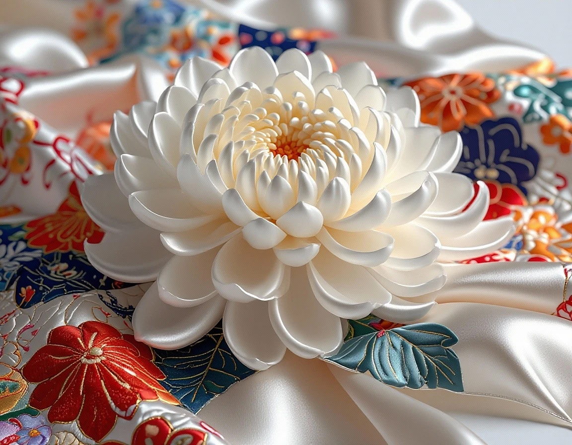 a work of art in a glossy satin silk fabric white rose in 3d, each petals are made of contrasting different large single strip of traditional japanese patchwork colorful quilting pattern, intricate geometric , and floral design, photorealistic, hyper detailed, 8k, hdr, studio lighting, extreme fine detail, velvet texture, glossy finish, lush colors, warm lighting, traditional , digital art, concept art, masterpiece