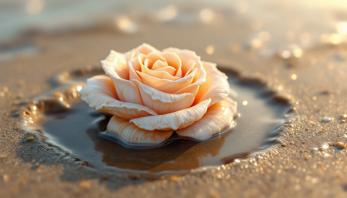 a close view of a rough sea shell in 3d, shaped like a rose, resting on the beach surrounded by a small puddle of water that creates a subtle reflection of the shell, highlighting its beautiful 3d patterns and texture. The shell's color is a warm, sunset-inspired hue, with vivid swirling patterns The camera angle is slightly askew, as if viewed from a low, beach-level perspective, adding to the sense of intimacy and discovery.