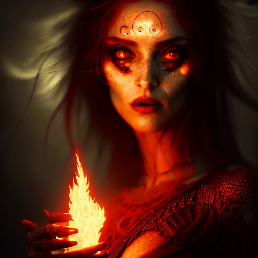 redshift style, a real perfect female body of beautiful witch, fire around her, perfect face, intricate, mysticsl, highly detailed, trending on artstation, by Tom Bagshaw and Seb McKinnon, 150mm portrait, photography, epic cinematic, octane render , denoise, photograph with a Hasselblad H3DII, extremely detailed