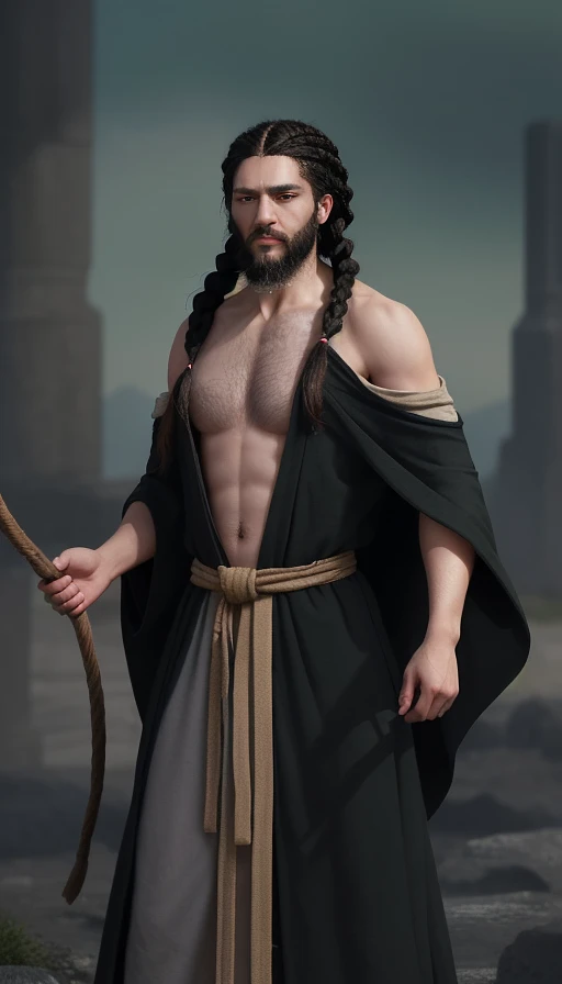 A 24 year hold man. He is of medium height, with green eyes and black hair. His hair is shoulder length and thickly braided. He has a beard pulled into two braids which reach to his collar bone. He is of a wiry, athletic build and is wearing arcane robes.