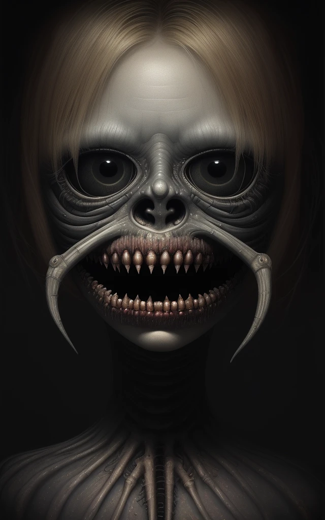 a detailed uhd portrait of a muted blonde laser thrashed oil painting in the style of tim burton enhanced by hr giger use a perfect blending of light and shadow to make this a eerie yet breathtaking image.