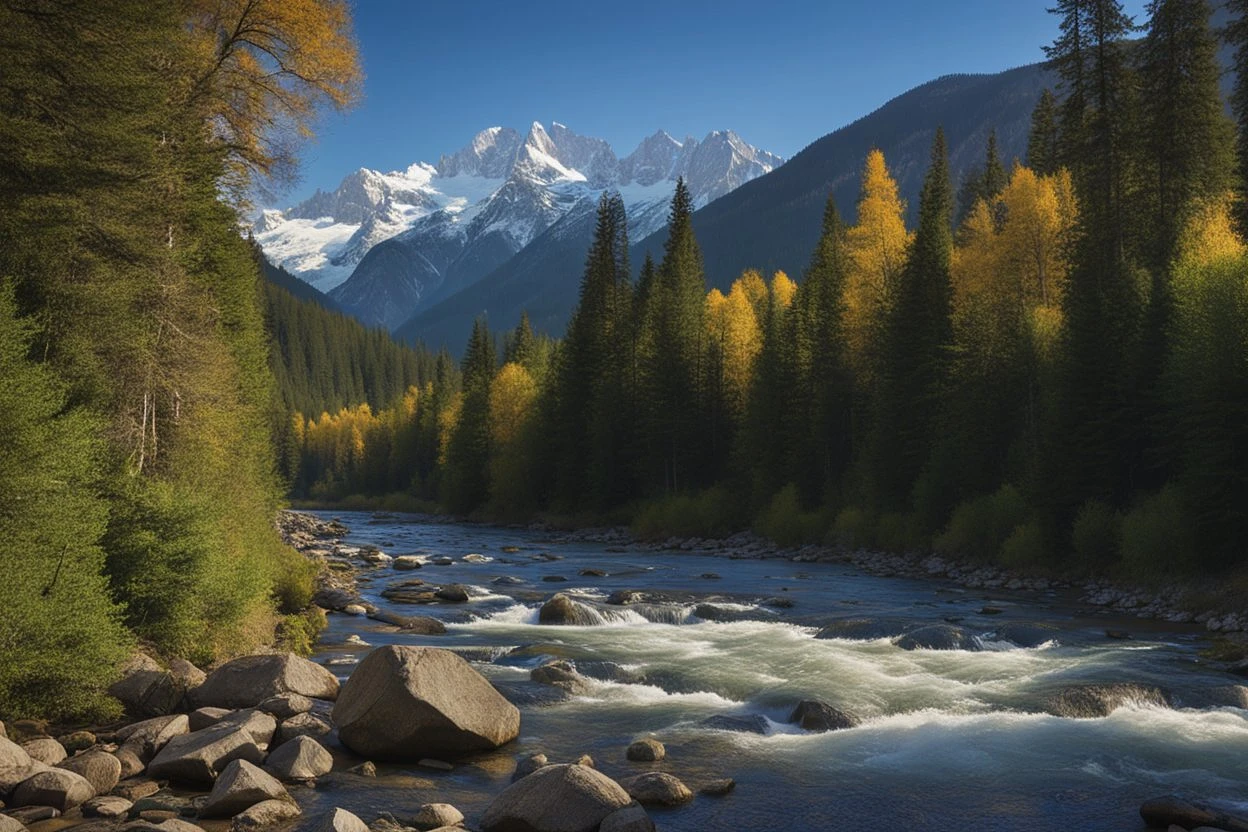 mother nature , river flowing from snow capped mountains, deep forest, creek, old-growth forest, confier, gorgeous trees , natural beauty , forest wildlife, mountains barely visible on horizon, 4k, natural --uplight --test