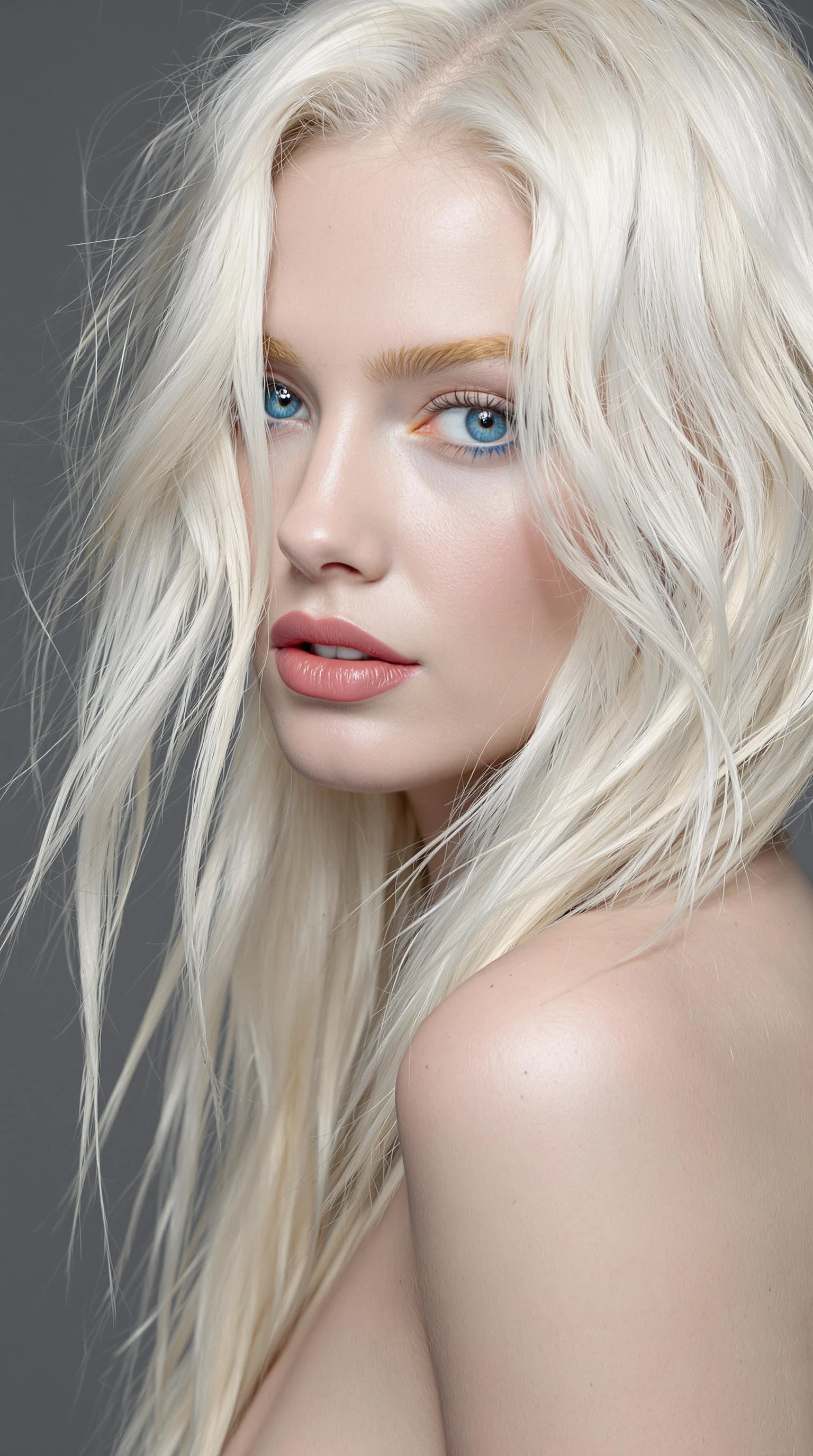 "The image is a striking close-up portrait of a model with lustrous, tousled platinum blonde hair cascading like a silken waterfall over her slender shoulders. Her alabaster skin radiates a gentle luminescence, akin to moonlight softly caressing a winter landscape. Her bright, vivid blue eyes resemble twin sapphires, deep and reflective, while her lush lips are painted a soft rose, accentuating her ethereal beauty. A subtle breeze lifts a lock of her hair, adding an element of serene dynamism to the otherwise tranquil scene. The background is a muted slate grey, allowing her features to be the focus. "
