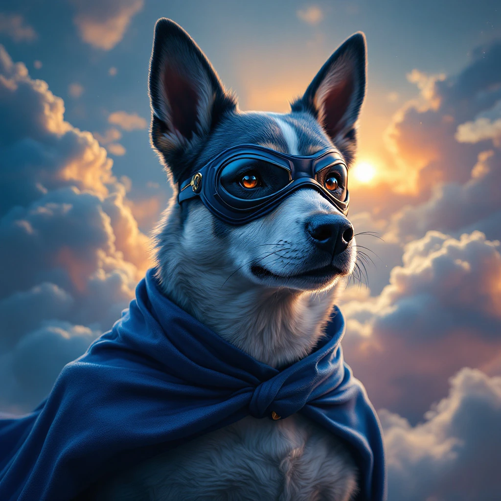 photo illustration of a dog superhero with a mask and aq cape from a world in the clouds, in the style of tanya shatseva, the stars art group (xing xing) , meghan howland, dark indigo and light cyan, mind-bending sculptures, realistic hyper-detail, fluid simplicity --ar 63:128 --personalize yruxpc2 --stylize 750 --v 6. 1 40k