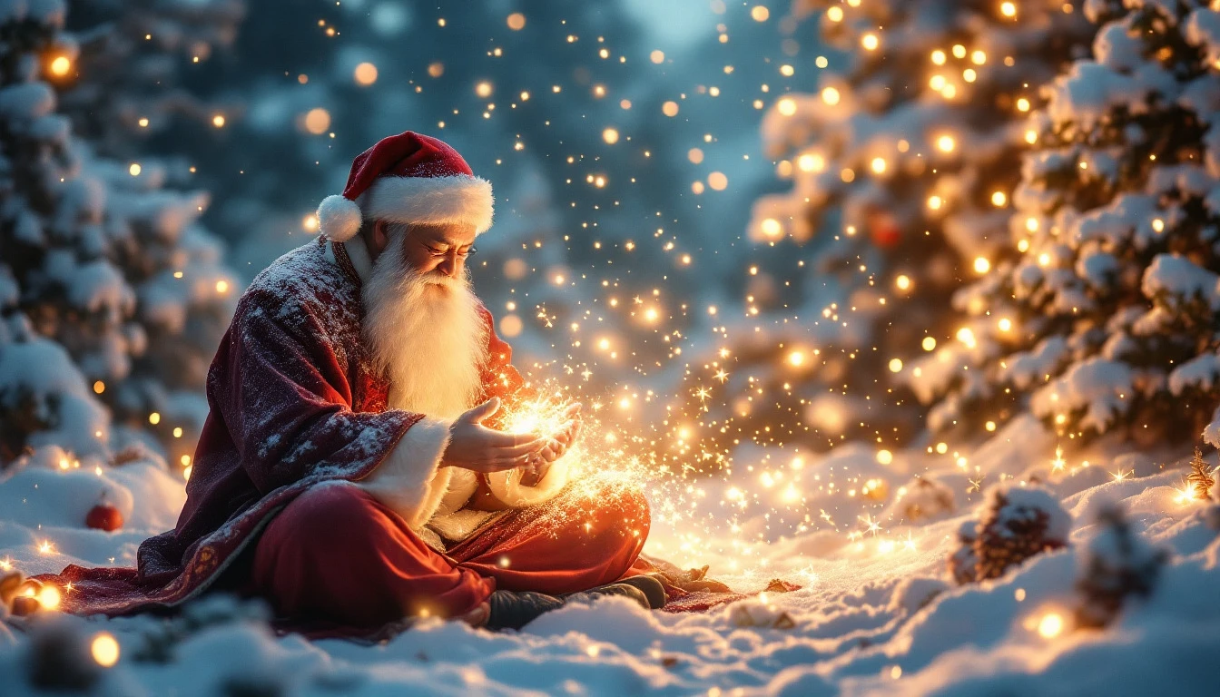 le père noël pratiquant le taï-chi-chuan dans la neige , univers féerique , lumineux ambiance noël et fêtes