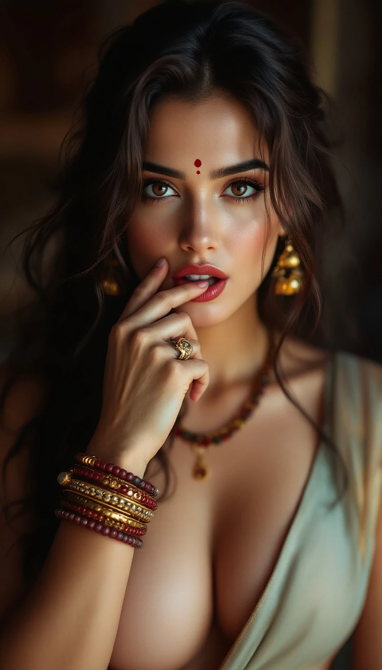 Jennifer Connelly, biting lip, 18-21 years old, brown hair, Indian hair style, saree, trying to removing the bra, inhaled chest, wide open eyes, A plus curvy shaped body structure, wearing bangles on hand, bindi, high-quality photo portrait, shot on a mobile camera, double eyelid --ar 34:65 --style raw