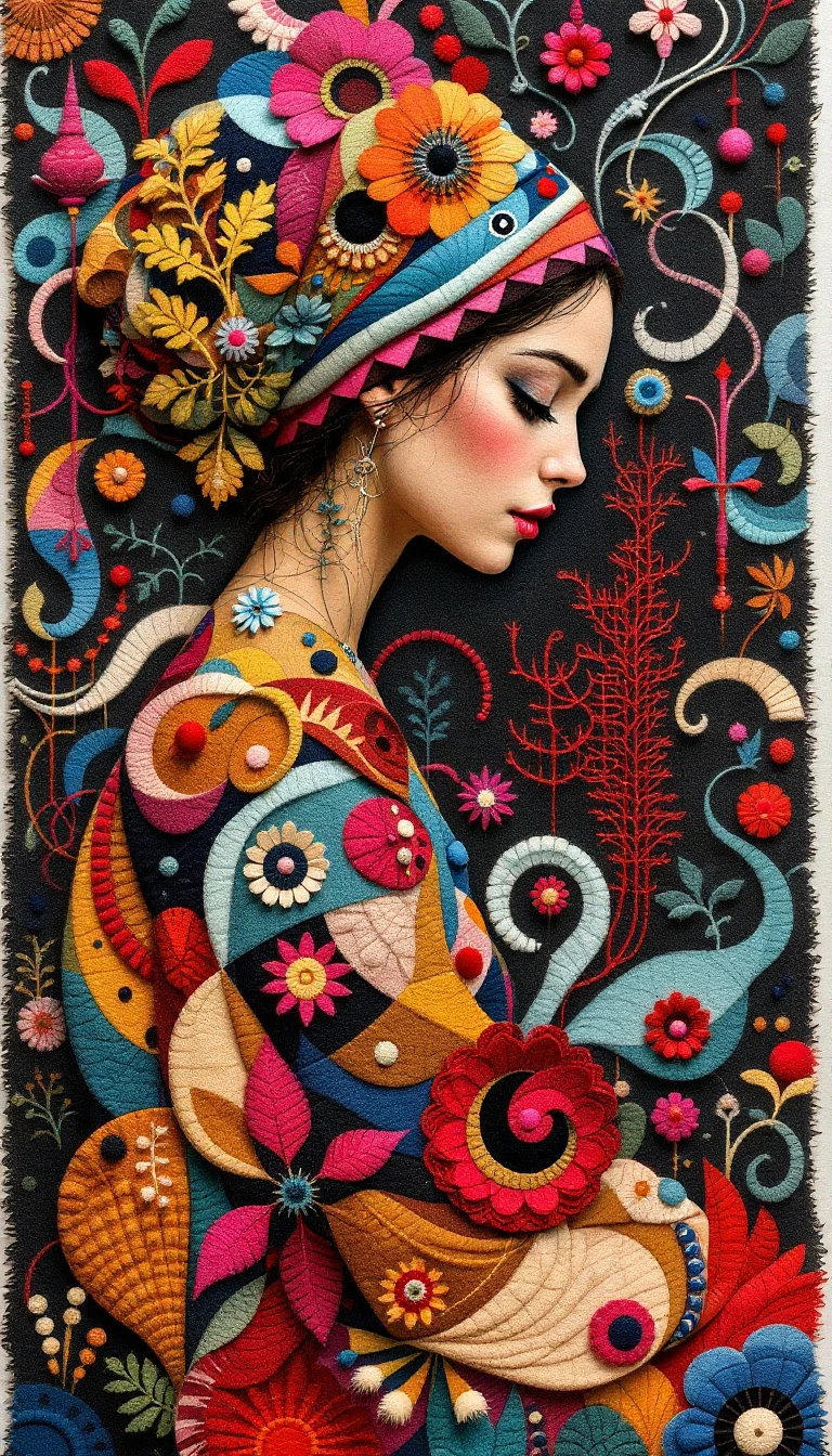 (20) A textile design piece, influenced by the complex patterns of traditional weaving, portrays a female weaver, her form intricately integrated with the vibrant tapestry she creates, emphasizing the interconnectedness of maker and creation and the beauty of craftsmanship and storytelling. Conceptual art, textile, patterns, symbolic.