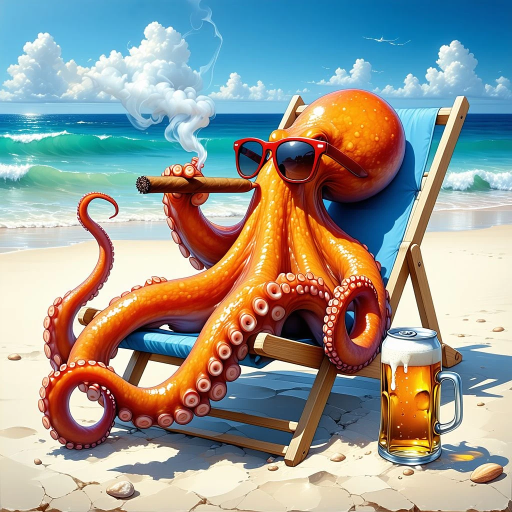 Highly detailed depiction of an octopus with sunglasses on sitting in a beach chair smoking a cigar and drinking a can of beer on a sunny day at the beach