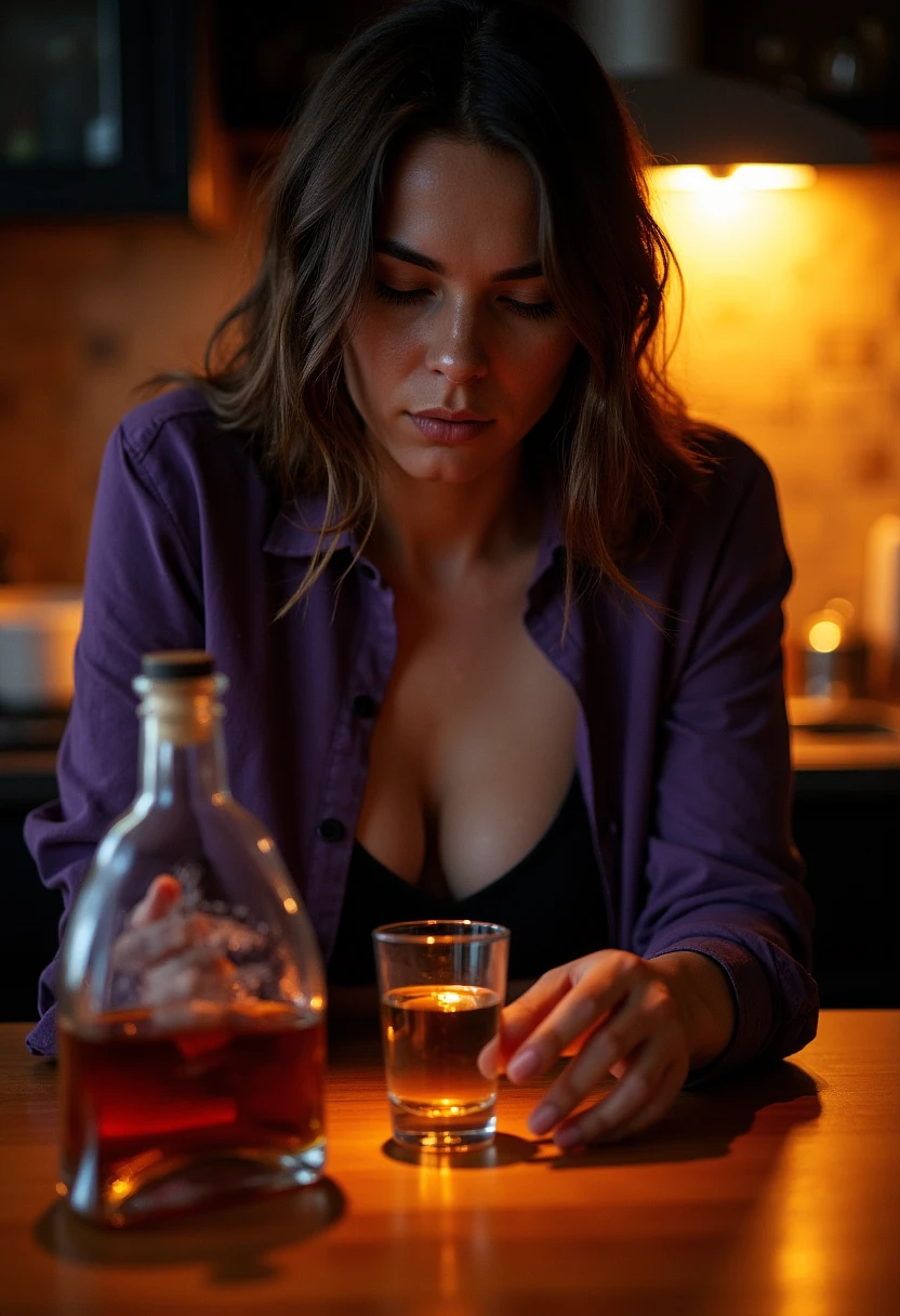 We see a dimly lit kitchen interior dominated by warm, amber-hued light emanating from soft spotlight fixtures – though the ambient overhead lighting contributes cool tones too, creating a rich contrast in shadow and illumination within this moody atmosphere. A woman with brunette hair sits or leans forward against a wooden table, looking depressed. Her unbuttoned purple blouse reveals her bare shoulders and a black bra. Directly in front of her, perhaps resting on a nearby surface, sits a whiskey bottle filled with amber liquid alongside a full shot glass – these gleam brightly against the subdued background, adding visual interest even as we understand their role primarily through context. The soft lighting casts long shadows and highlights textures subtly, enhancing rather than defining this moment of quiet despair following what was an extremely hard day for her.