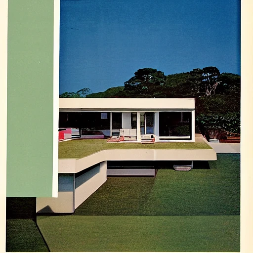hyper realistic eye level exterior photo of a mid century modern style house overlooking the ocean, daylight, indirect lighting, AD magazine, Frank Lloyd, Eames, Mies van der Rohe