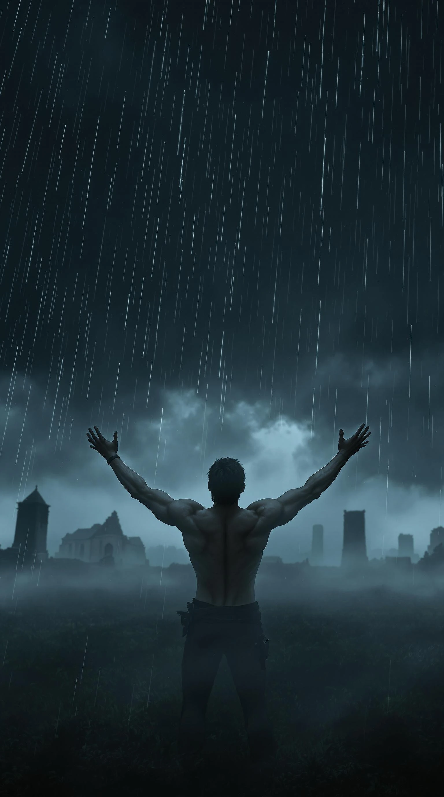 Adam stands in the center of a stormy field, his hands stretched toward the darkened sky, as rain begins to pour. His muscular figure is illuminated by the faint, jagged streaks of lightning in the distance. His expression is one of despair, and the shadows around him create an oppressive atmosphere. The mist rolls heavily over the ground, obscuring distant ruins. extremely detailed, photorealistic, 8k high resolution, RAW footage, ultra realistic, cinematic film --ar 9:16 --v 6. 1