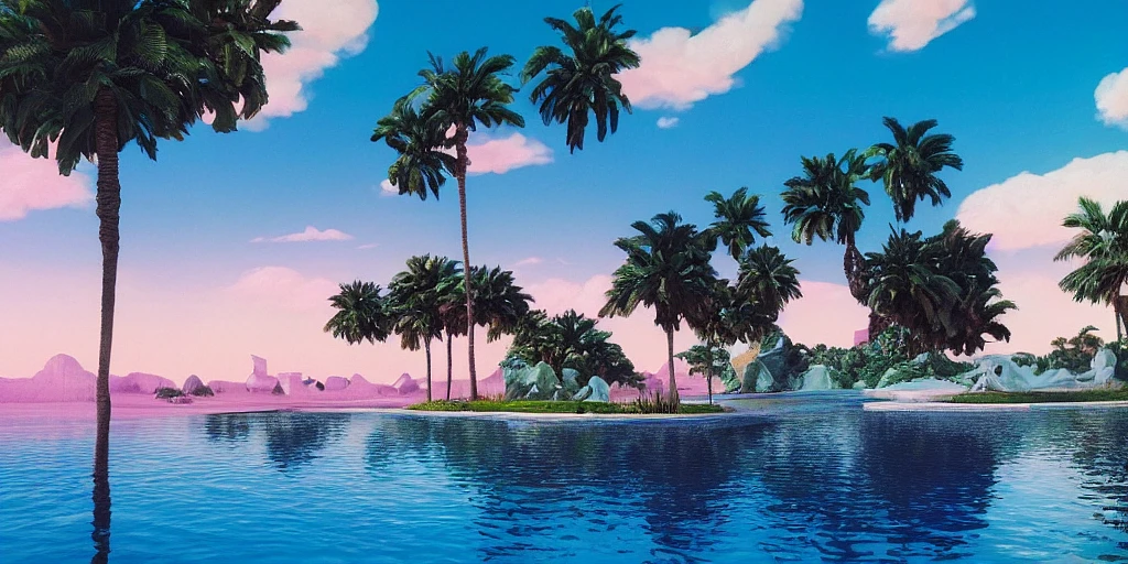 Beeple masterpiece, hyperrealistic surrealism, award winning masterpiece with incredible details, epic stunning, infinity pool, a surreal vaporwave liminal space, highly detailed, trending on ArtStation, calming, meditative, pink arches, palm trees, vaporwave, surreal, sharp details, dreamscape, giant gold head statue ruins, crystal clear water, sunrise