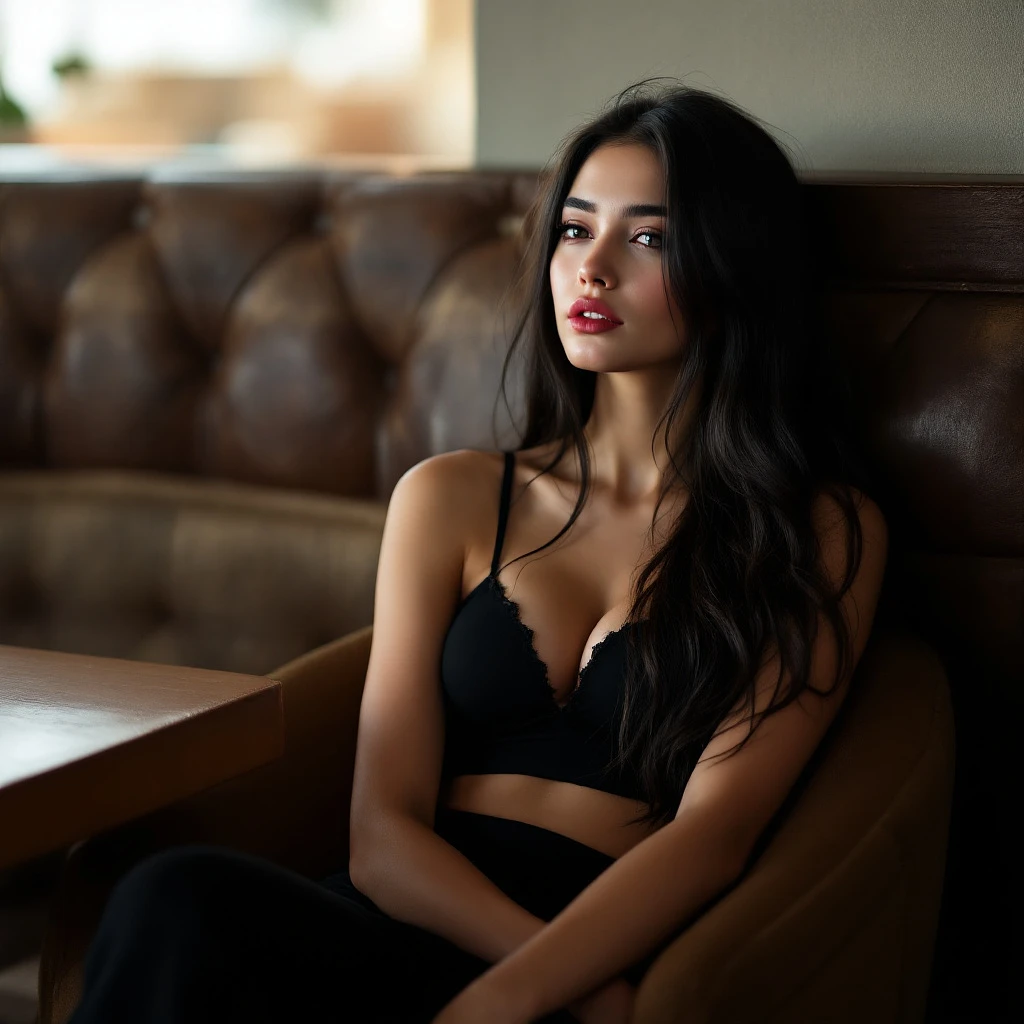 arafed woman sitting in a chair in a restaurant wearing a black top, aestheticism, tachisme, inspired by Elina Karimova, tiktok 4 k uhd image, beautiful midriff, tinyest midriff ever, beautiful asian woman sitting, pale-skinned persian girl