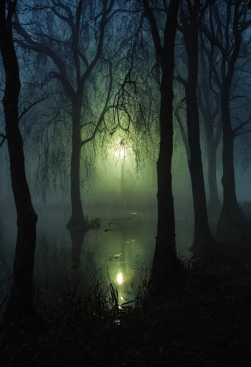 A dense, shadowy forest at the edge of a mist-shrouded willow grove, where the light from an unseen fire dances across the water and creates an eerie glow in the distance.