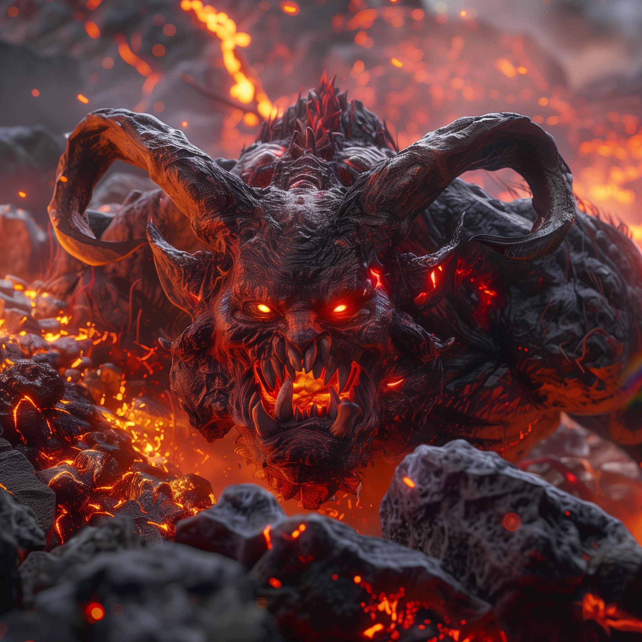 A hyper-realistic, high-quality super detailed image of a terrifying monster. The monster has a twisted, demonic appearance with large, curved horns, glowing red eyes, and jagged teeth. It is standing in a fiery, hellish landscape with lava flows and burning rocks. The environment is filled with intense heat and flames, creating a chaotic and menacing atmosphere.