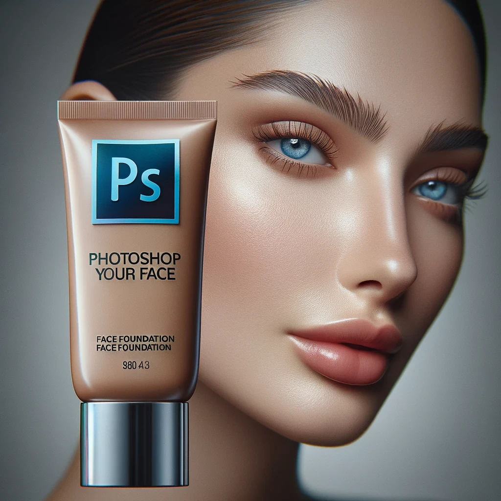 Product Photography: A hyper-realistic, aesthetic image, presented in a 2:3 ratio, capturing a face foundation product. The packaging distinctively features a graphic that resembles the Photoshop logo. The only text on the packaging reads 'Photoshop your face', emphasizing the product's transformative power. In the softly blurred background, right behind the product, the face of a beautiful model is visible, her flawless skin serving as an endorsement of the foundation's efficacy. Every aspect of the image, from the texture of the packaging to the model's radiant complexion, is captured in high resolution.