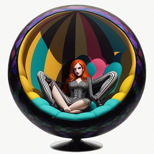 Product photography, a colorful egg chair with Black widow striped pattern on it, in the style of esteban vicente, pixel perfect, illusionary spaces, furaffinity, brian oldham, high tonal range, cloisonnism