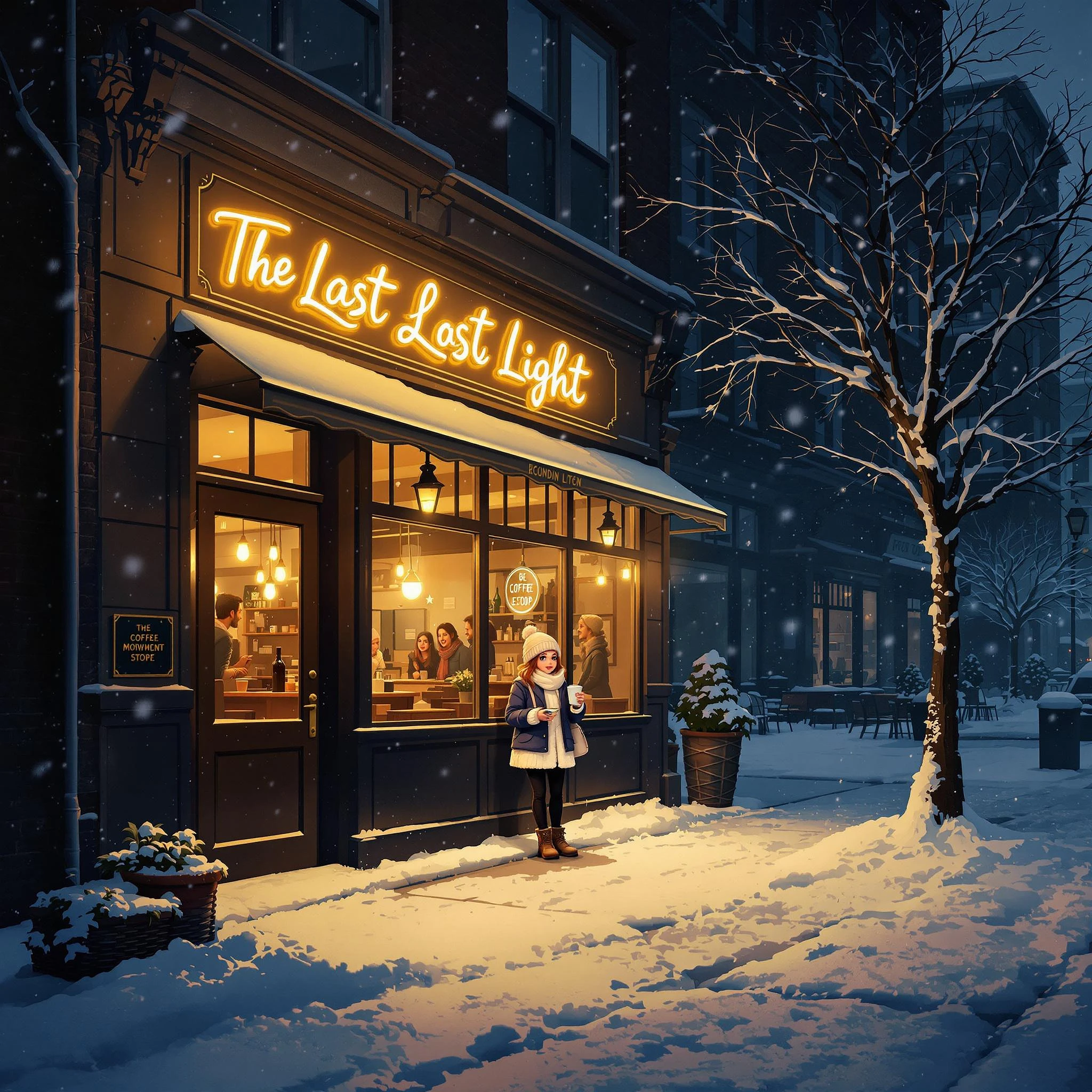 An enchanting winter scene of a small coffee shop named 'The Last Light' on a snowy street at night. The shop's neon sign glows faintly, casting a warm golden light onto the snow-covered sidewalk. The surrounding area is dark and quiet, with other storefronts appearing closed and unlit, emphasizing the shop's glow. Through the shop's frosted windows, a soft, inviting light spills out, showing glimpses of people sharing warm drinks and laughter inside. Snow gently falls, creating a serene and magical atmosphere. A young girl with a scarf and hat stands near the entrance, holding a glowing cup of coffee, her face lit with hope and wonder. The background includes darkened city buildings, adding contrast to the vibrant warmth of the coffee shop. The scene radiates the themes of light, hope, and community in the midst of darkness. "