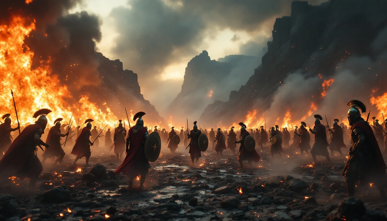 Ultra-realistic . Wide shot of the pass engulfed in fire and smoke, scattered across the ground. [Achaemenid Persian warriors in period armor and helmets with chainmail veils amidst the chaos.]