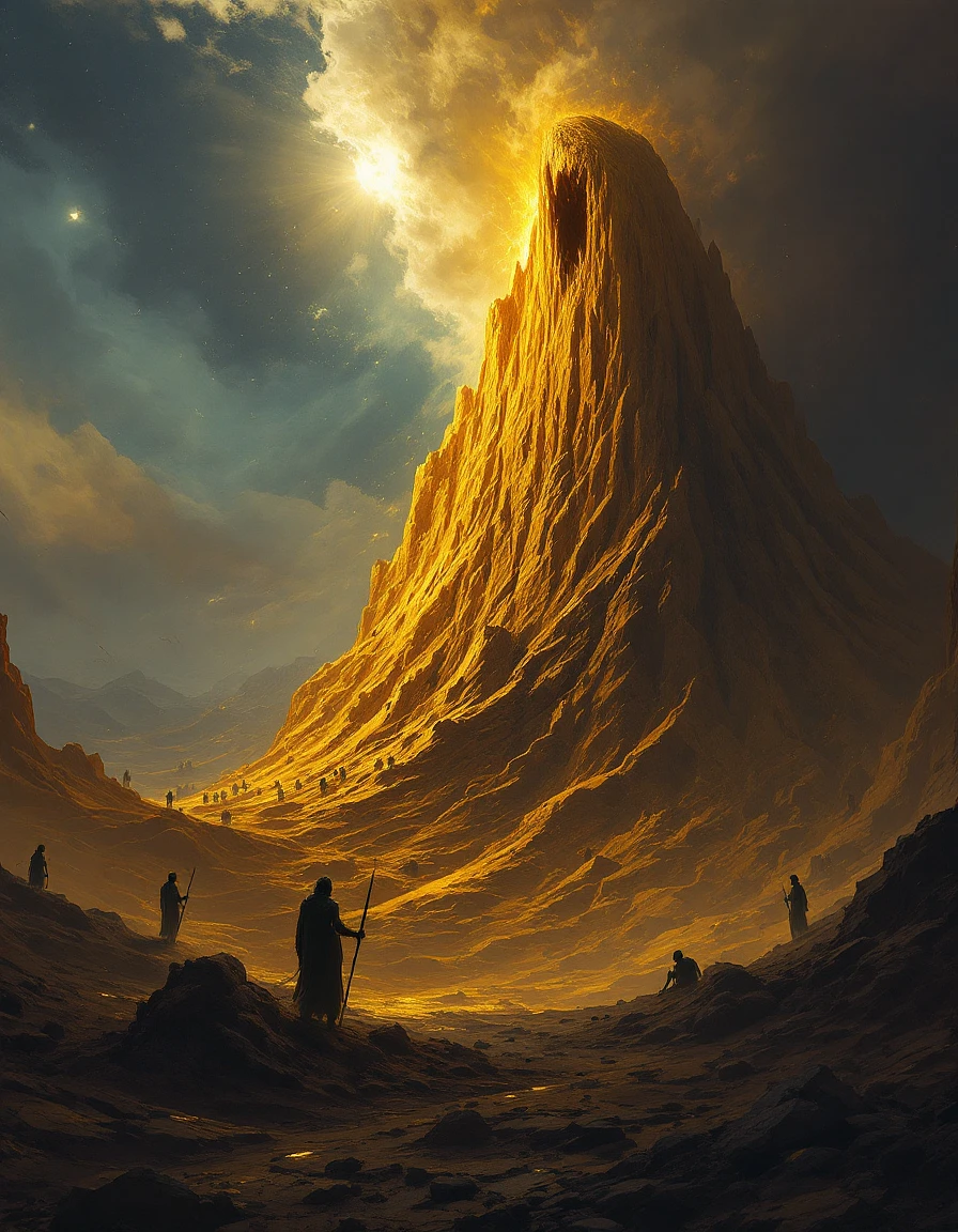 There was a famine so great, the sun turned away. (Rivers stagnated:1.7) . The wind carried the cries of the starving. The people of the Hollow Lands had to obey the Edict: "Winnow away the heads. Preserve the bodies. ". The sacred ritual raised whispers from beneath the earth. Their bodies changed, their scent thickened, musky and metallic, and the hunger inside them turned into something powerful. They grew stronger, faster. They no longer feared the creatures that lurked in the dark, the ancient Morimo, whose (long fingers crept into their dreams:1.9) , nor the Great Manes, the restless dead who wailed from the vast pit in the North. As the ritual spread, the ground trembled. The bodies, headless, preserved, waiting, became altars of transformation. And the deeper they dug, the more they found. The soil was not empty; it was filled with bones, with old hunger, with something watching from beneath. Were they consuming power, or was something consuming them? In the style of Joao Ruas.