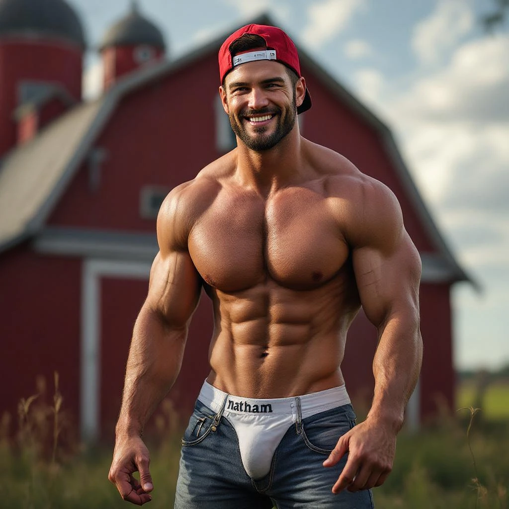 Full body image, looking at us, Nathan drake, shirtless, muscular, unbuttoned jeans, white underwear, red backwards baseball hat, nig bare feet, standing in grass by red barn, flexing one bicep, smiling
