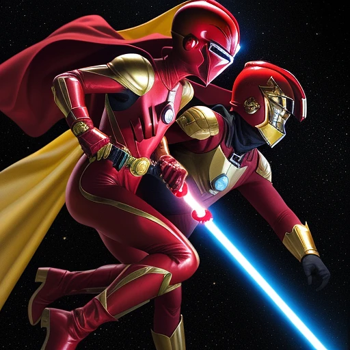 RED SPANDEX SUIT, WITH GOLD GLOVES AND BOOTS , wearing a RED ranger helmet HOLDING a lightsaber vs ANOTHER BLACK SPANDEX SUIT CHARACTER , WITH GOLD GLOVES AND BOOTS , wearing a black helmet and yellow cape HOLDING a lightsaber IN A SWORD FIGHT in space.