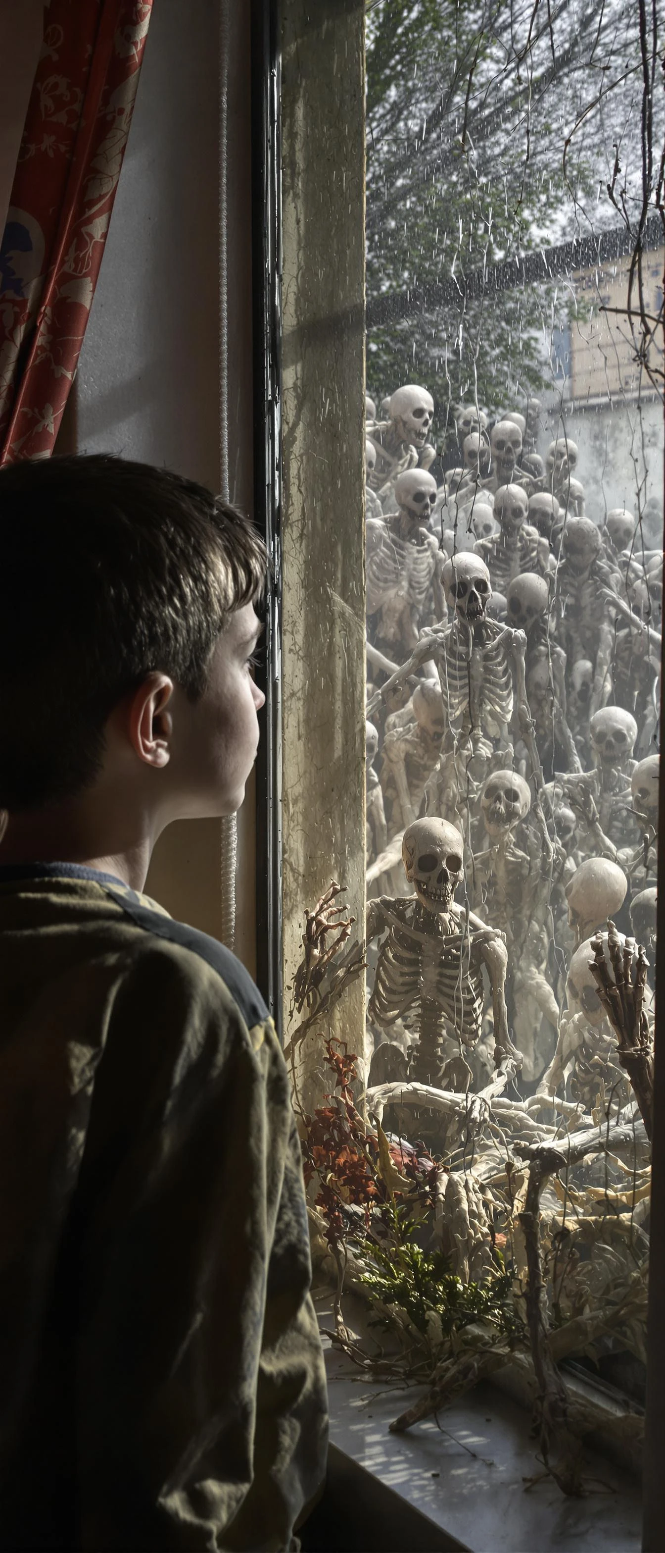 A boy looking from a window at daylight and sees many walking dead people . Their body are fleshy or half fleshy . Some bodies have skin intact . Some bodeis are semi skeleton and semi fleshy . Their body are exposed . Hyperrealistic. Hyper details . Hyper face and body details . 8k . High quality .