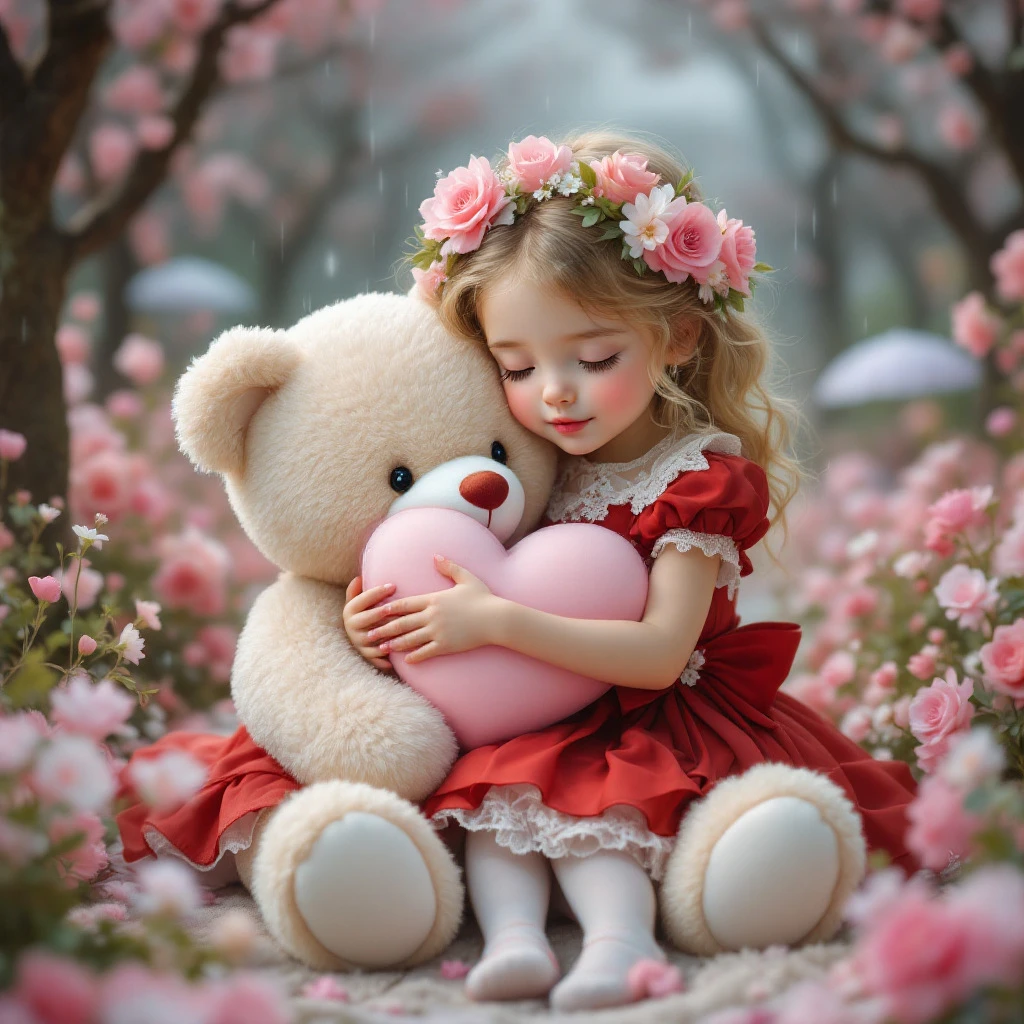 A cute and pretty young girl with light blonde hair and rosy cheeks, around 5 to 7 years old, hugs a teddy bear. The girl wears a red and white layered dress with ruffles and lace, a large red bow accentuating her waist. She wears detailed white stockings. The teddy bear is a soft pearl color with small pink flowers on its head. The girl rests her head on the bear and holds a large light pink heart. The background is a soft spring garden scene in pastel colors with pink and light purple flowers, trees and umbrellas. A gentle rain lingers in the atmosphere. The overall style is delicate, romantic and detailed with soft lighting, creating a warm and sweet atmosphere. The colors are soft and gentle, evoking a sense of calm and innocence. The perspective is slightly from below, focusing on the interaction between the girl and the bear. Highly detailed painted style. in the style of Chantilly lace --v 6