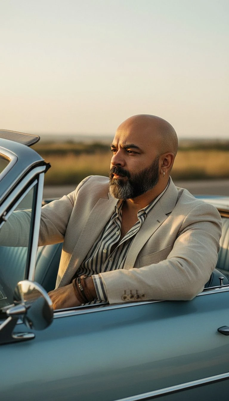 Create a movie-level ultra-realistic photo of a upload image of a man. The face matches the reference image 100. 9999% 35mm Kodak Portra 400 film, cinematic portrait shot during golden hour. Aspect ratio 9:16 Captured with a Canon AE-1 using 50mm f/1. 4 lens, shutter speed 1/250s, white balance 5200K (daylight) , ISO 400. A mid-shot portrait of a man sitting in a vintage convertible car, leaning on the door with his left arm resting casually. He wears a light beige linen blazer, striped open-collar shirt, and leather bracelets. His gaze is directed toward the horizon, expressing contemplation and calm confidence. The composition uses soft, natural sunlight that illuminates his face from the side, creating gentle golden highlights and smooth shadows across his profile and the car’s curves. The focus is on the man’s thoughtful expression, with shallow depth of field (f/1.4) blurring the background sky for cinematic separation. Mood & Tone: nostalgic, warm, introspective, timeless elegance. Color Palette: soft amber, golden beige, charcoal black, muted sky blue. Film Aesthetic: subtle grain, creamy highlights, balanced contrast typical of Portra 400. keep face features original