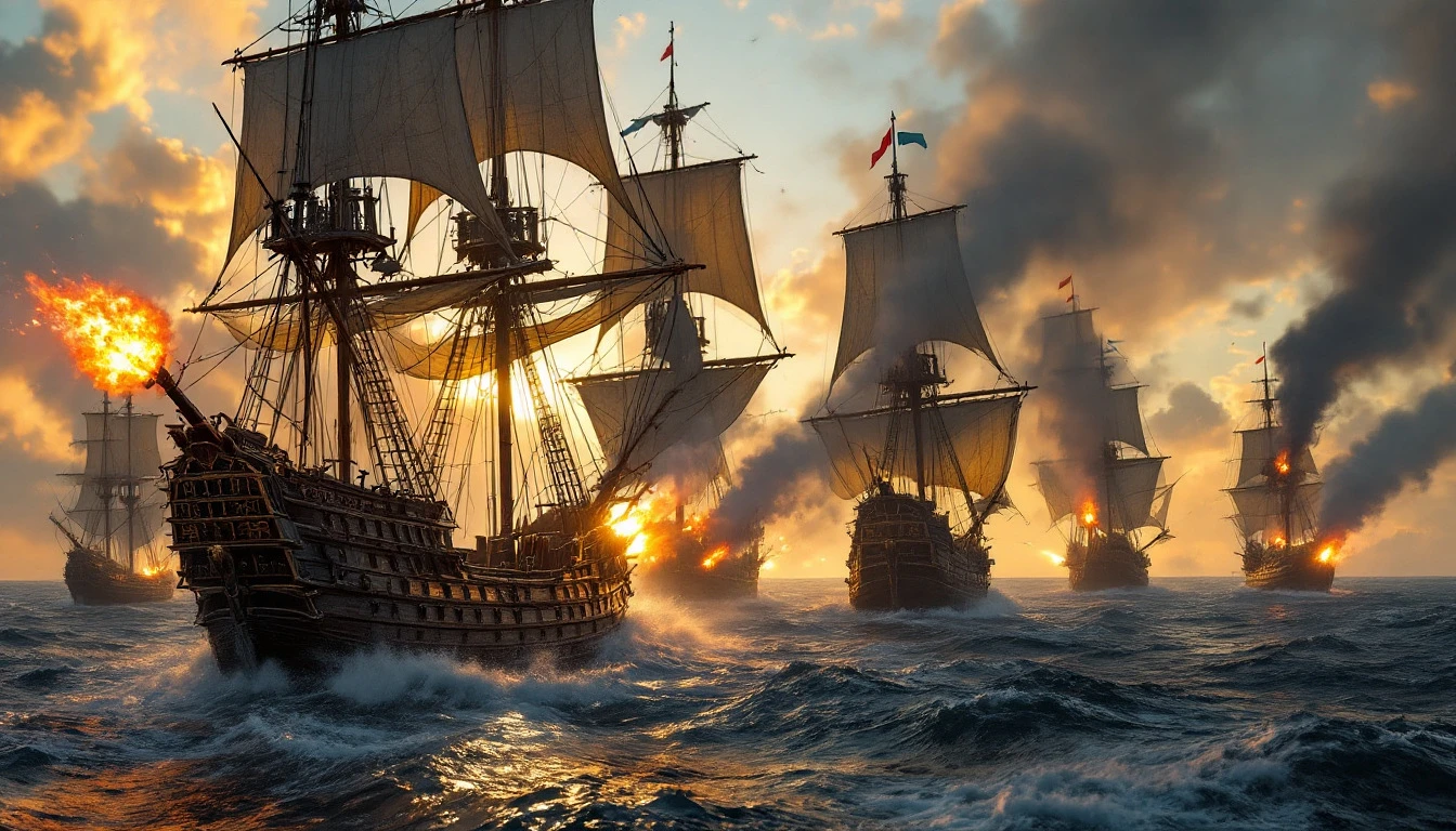 Photo of a ultra realistic of Portuguese ships attacking Malacca in the 15th century, dramatic war, firing cannons, pale sunrise, cinematic lighting, battered, low angle, trending on artstation, 4k, hyper realistic, focused, extreme details, unreal engine 5, cinematic, masterpiece, art by studio ghibli, --ar 16:9-, intricate artwork by john william turner