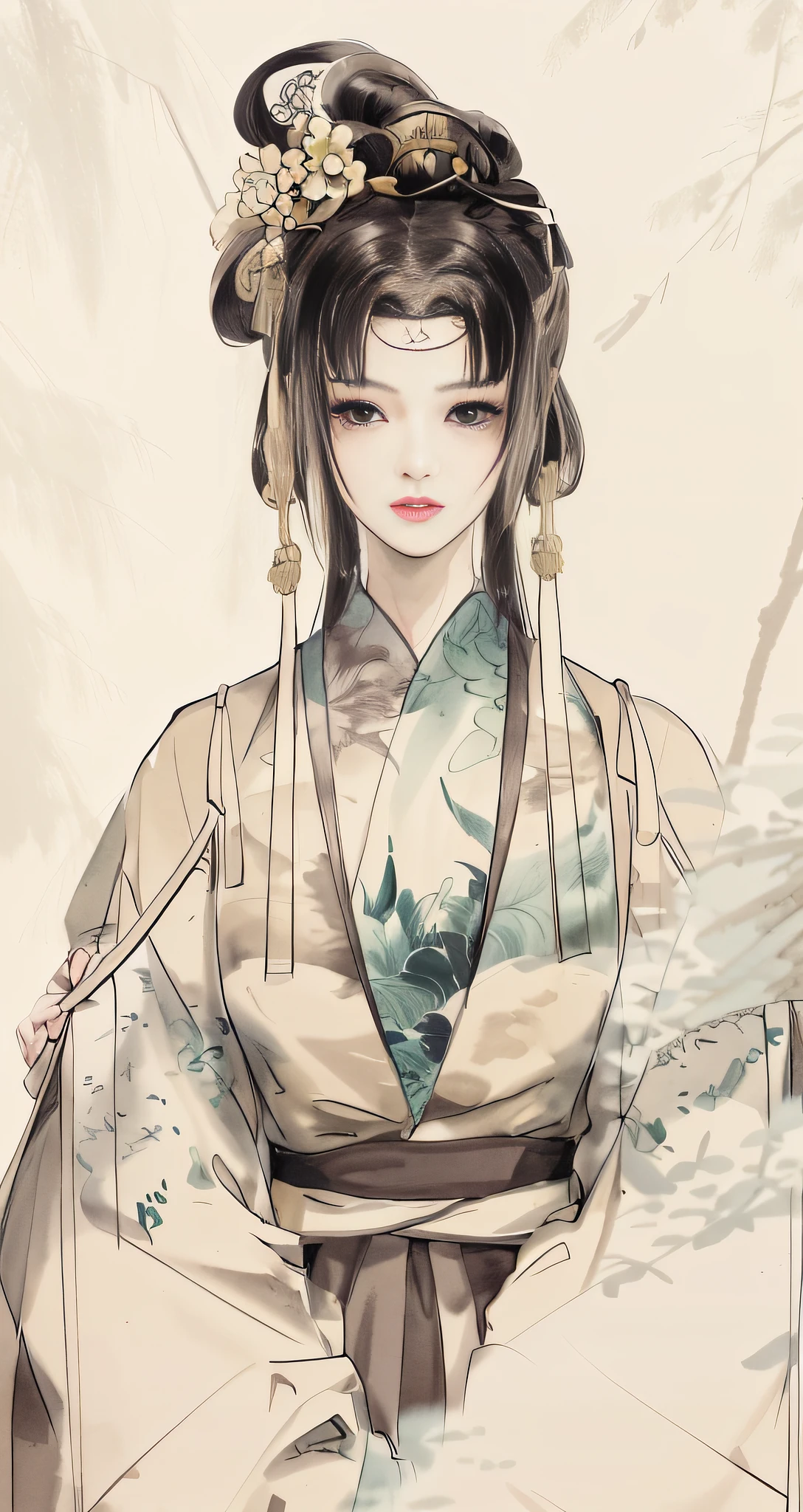 shukezouma, negative space, , shuimobysim , portrait of a woman standing , willow branches, (masterpiece, best quality:1.2) , traditional chinese ink painting, (traditional Chinese painting) , monochrome, modelshoot style, peaceful, (smile) , looking at viewer, wearing long hanfu, hanfu, song, willow tree in background, wuchangshuo, Distant mountains, small lakes, gazebos, lonely boats,