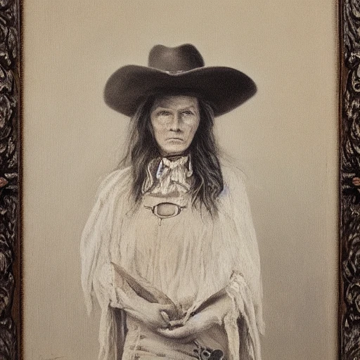 High resolution photography of a ultra realistican old cowgirl in 19th century, beautiful painting with highly detailed face by tim cox, with a wide cowboy hat, which gives him a mysterious and so gloomy, he wears a long cape and poncho , which gives him an air of a lonely and carefree protagonist, Beneath the cloak he wears a white shirt and a dark brown vest, which is often covered in dust and worn due to the arid conditions of the environment, he also wears a wide belt and a pair of revolvers crossed at the waist, highlighting his role as a bounty hunter and his skill with weapons, His calm and confident demeanor, combined with his scruffy yet elegant appearance, creates an iconic and recognizable cowboy