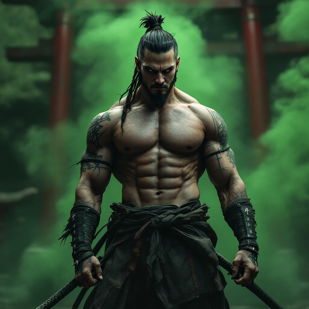 samurai, epic professional photo shoot, standing, tatto, muscular, katanawith kanji, green smoke, style of demon slayer anime, hair style braids, green jordan 5 sneaker, ultra realistic, back ground pagoda, melancholic