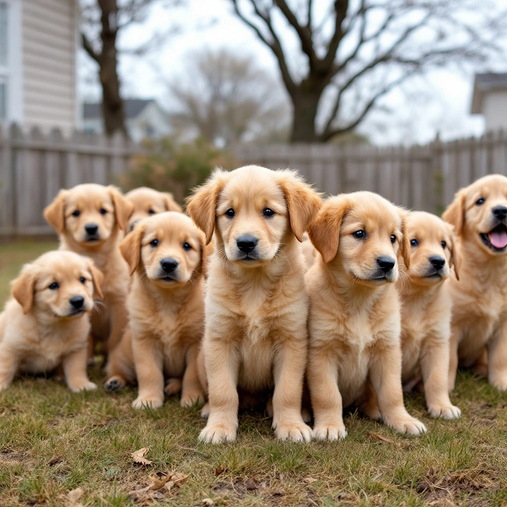 a gaggle of golden retriever puppies in the backyard