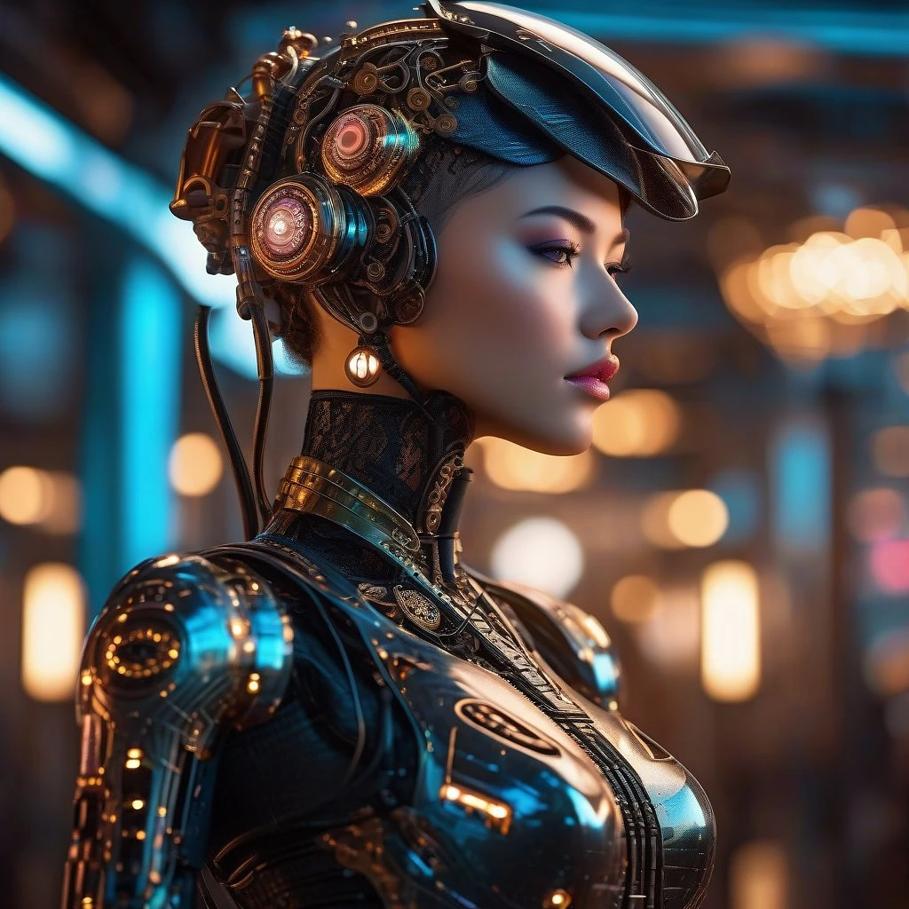 photorealistic top quality photo, full-body shot, skin pores, beautiful female humanoid steampunk robot, ava, ex-machina (black:3) , intricate mechanism, visible body organs, expressive eyes, intricate tiniest details, rich color, reflections, rim lighting, starburst, bokeh