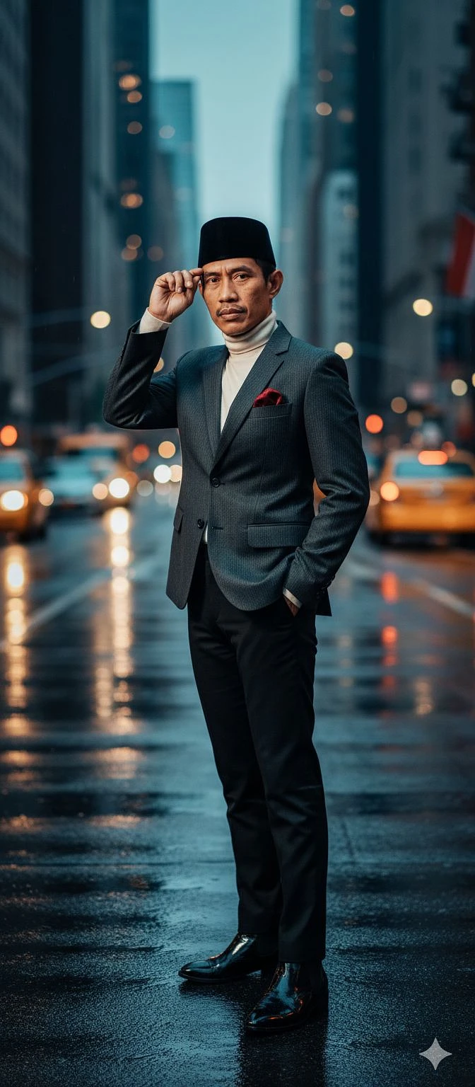 A high-fashion Vogue-style photoshoot of a man posing confidently on a New York street at dusk. The scene features professional cinematic lighting, soft reflections on the pavement, and elegant urban atmosphere. The model wears a modern tailored outfit, with natural yet expressive body language. The composition is minimalist and artistic, emphasizing texture, contrast, and mood. Ultra-realistic photography, 50mm lens, shallow depth of field, no text, editorial magazine aesthetic.