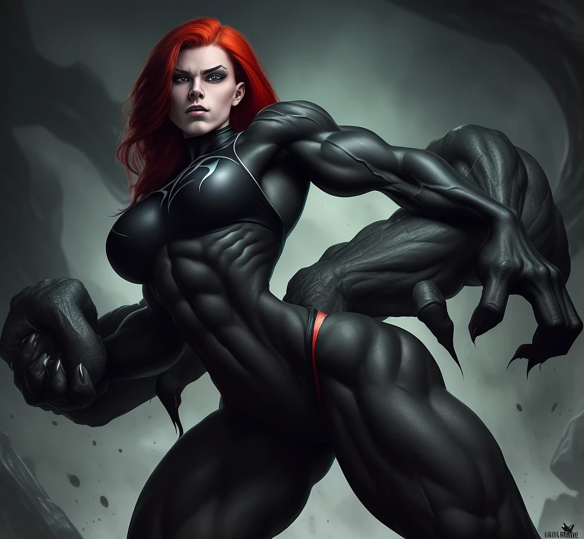 1 young beautiful bodybuilder woman with a wide strong jaw wearing a black monster symbiote, red hair, green eyes, SFW, big arms, big legs,
