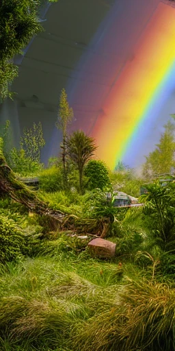 overgrown postapocalyptic ruins, birds in the sky, a rainbow, waterfall : : close shot : : 3 5 mm, realism, octane render, 8 k, exploration, cinematic, trending on artstation, abstract, 3 5 mm camera, unreal engine, hyper detailed, photo - realistic maximum detail, volumetric light, moody cinematic epic concept art, realistic matte painting, hyper photorealistic, concept art, volumetric light, cinematic epic, octane render, 8 k, corona render, movie concept art, octane render, 8 k, corona render, cinematic, trending on artstation, movie concept art, cinematic composition, ultra - detailed, realistic, hyper - realistic, volumetric lighting, 8 k