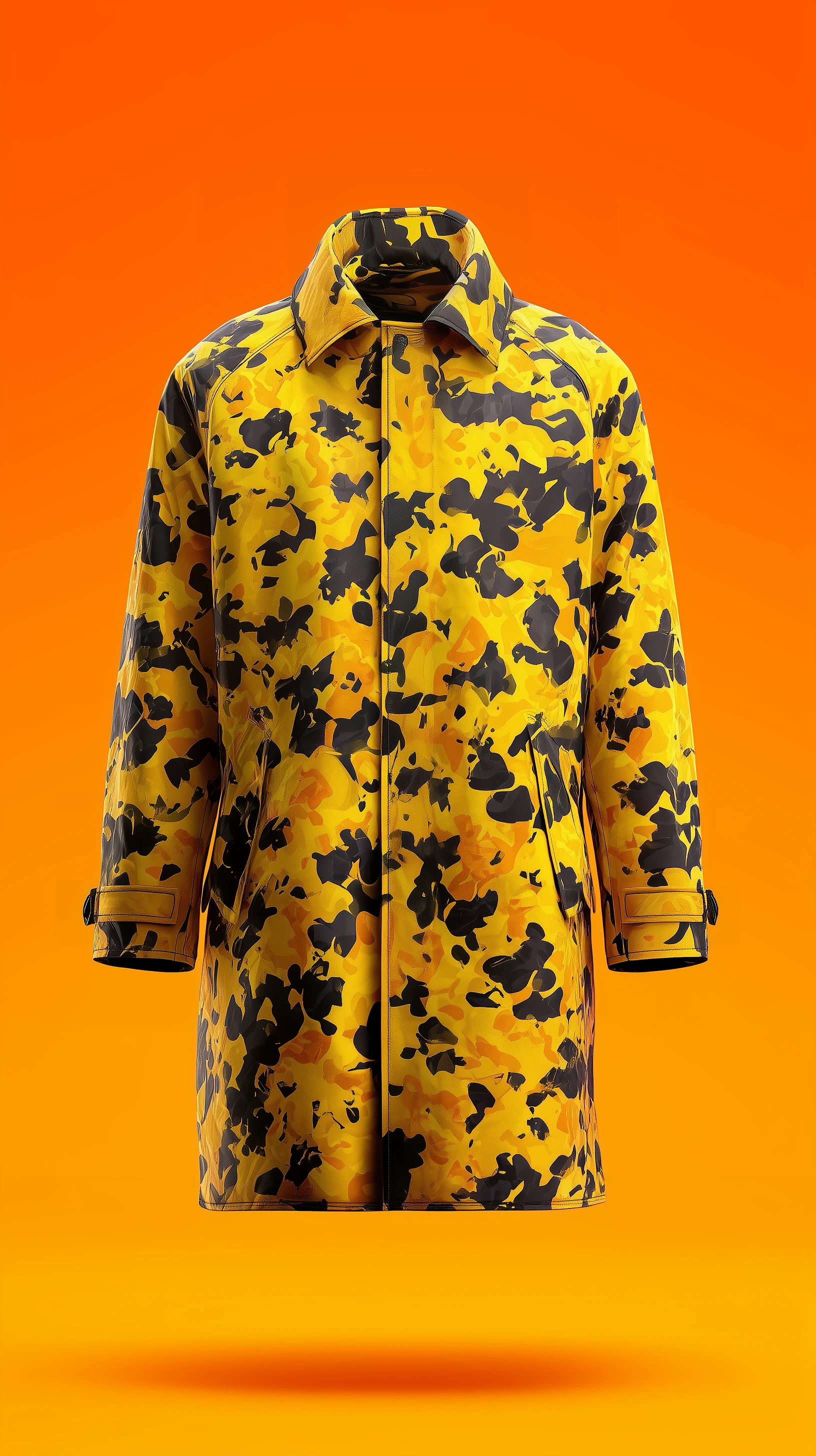 mock-up, central front composition, trench coat, yellow and black colors fabric, seamless camouflage pattern texture, clean vibrant orange gradient backdrop, centered on torso, product only, realistic collar and hem detail, true garment proportions --ar 9:16 --raw