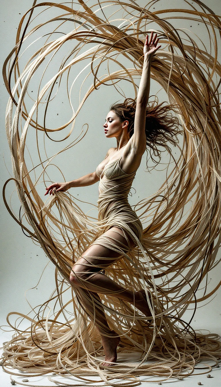 A dynamic, full-body image of a woman manipulating a giant, sentient thread, her movements creating intricate patterns that swirl and flow around her, the material forming both a dance partner and a creative tool, highlighting the powerful bond between artist and medium.