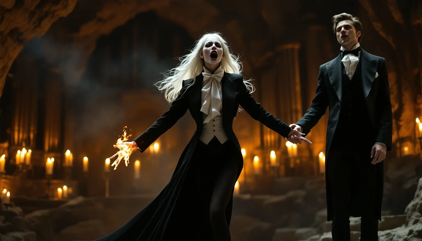 phantom of the opera, Woman, tall, slender, long legs, long white hair, right side of face is severely disfigured by fire, she wears a fitted tuxedo, white shirt and white bow tie, long flowing black skirt four inch black stilettos are visible, she sings in an operatic style, arms wide, in a gothic lair , cave with a large pipe organ. extreme wide to show entire body. A handsome man in nineteenth century formal wear stands ten feet behind her mesmerized by her singing.